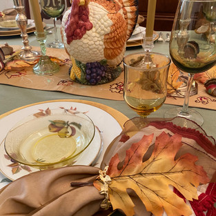 Thanksgiving was definitely a smaller affair compared to years past, but the food was delicious and the company was wonderful! Good friend Kissy and I had several ideas to set the table and in the end we used my Royal Worcester Evesham Gold china. I have always loved this pattern and it is the first china I started buying myself when I moved into my own place. I have added to it for years, finding it as TJ Maxx, on FB Marketplace and online. I have many different serving pieces, glasses and my treasured cream soup bowls.