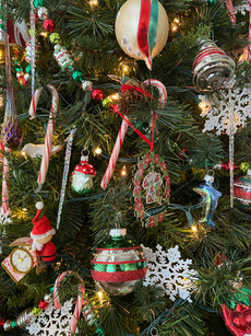 The living room tree is full of memories, ornaments from my Grandmothers, vintage ornaments, vacations, wedding present ornaments, Shiny Brites, Russian Radkos and ornaments from Russia. It is filled with candy canes, icicles, snowflakes, birds and bows and berries -- all topped with a sweet vintage angel!